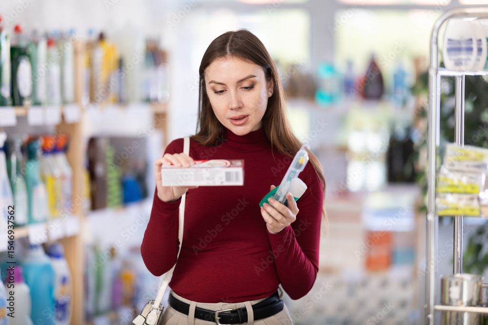 Young woman buyer chooses toothpaste and toothbrush in household chemicals store
