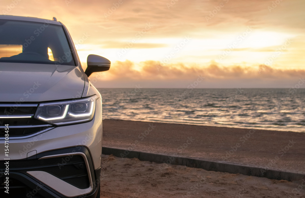 Silhouetted by a colorful sunset, a gray car stands near the ocean's edge. The warm light and open space capture a moment of solitude and exploration.