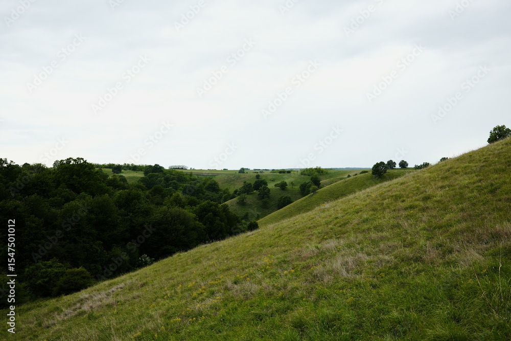 Grassy hill slope in Zagajicka Brda under soft light, with layers of hills fading into the distance and forests filling the valleys. Serbia country in spring season