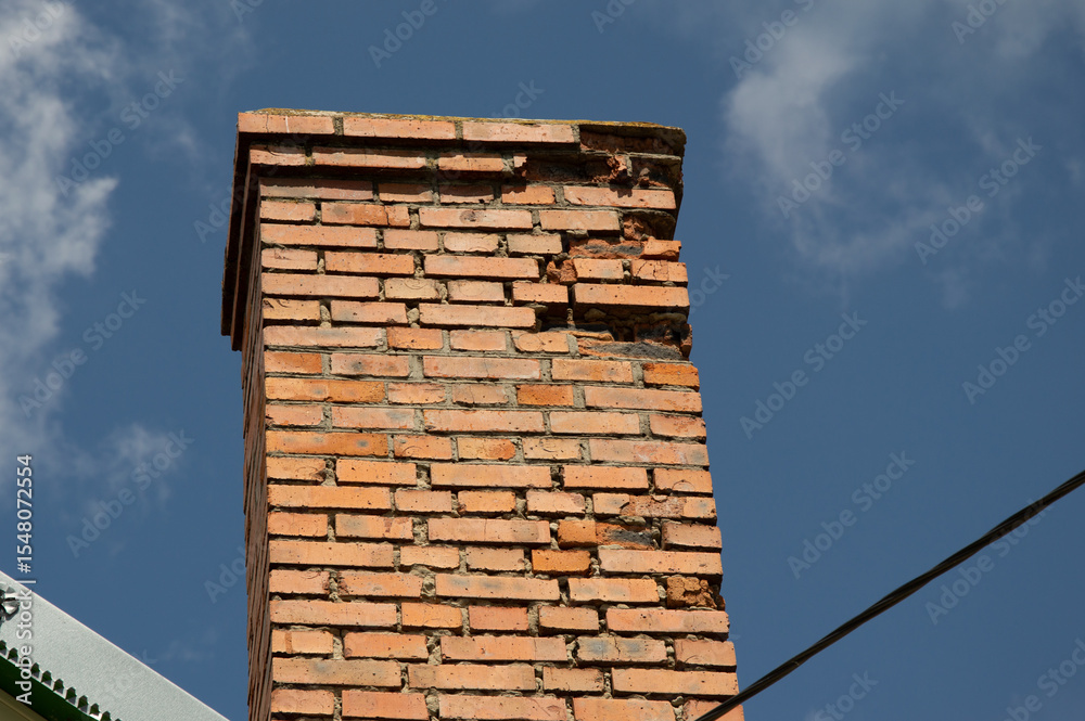 Chimney displays significant wear and damage with cracks against a backdrop of a clear blue sky, indicating possible structural concerns