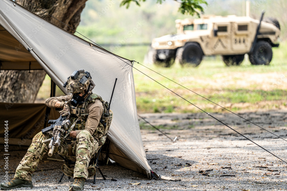 Special forces soldiers preparing tactical gear at military field base camp with weapons and equipment during outdoor training operation.