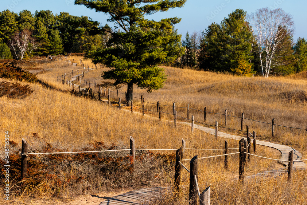 The winding, floating cordwalk safely leads over the sand dunes within Kohler-Andrae State Park, Sheboygan, Wisconsin in early November