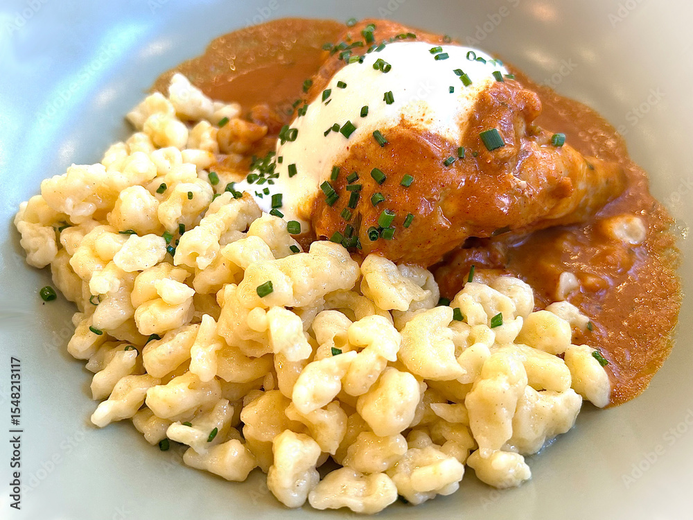 Austrian Paprikahendl served with soft homemade Nockerl (Austrian dumplings), topped with creamy sour cream and freshly chopped chives. A hearty and flavorful traditional dish, perfect for showcasing