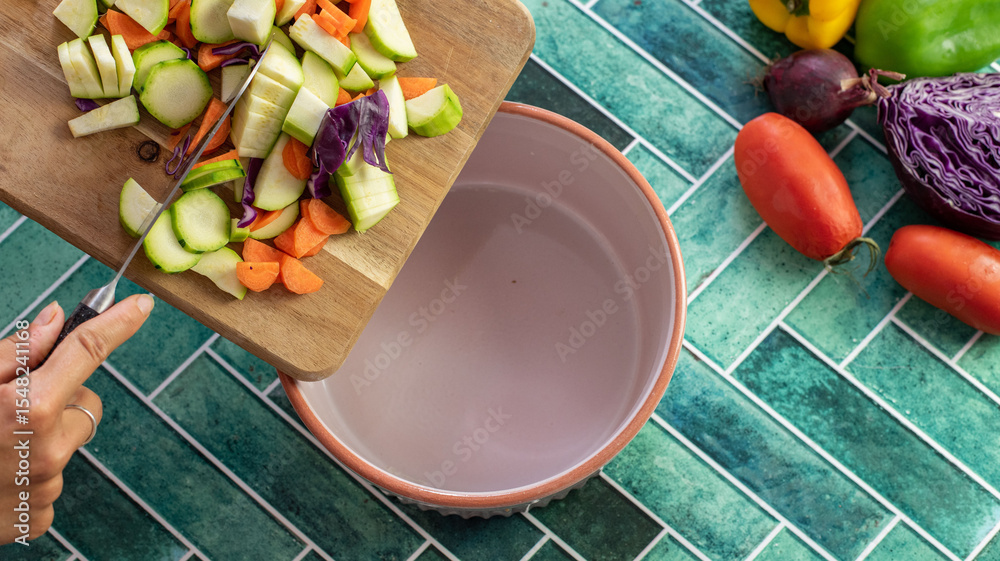 A female hand gently pours freshly chopped vegetables — including zucchini, carrot, pepper, and onion — into a ceramic bowl. The background features aesthetic green tiles and a rustic countertop.