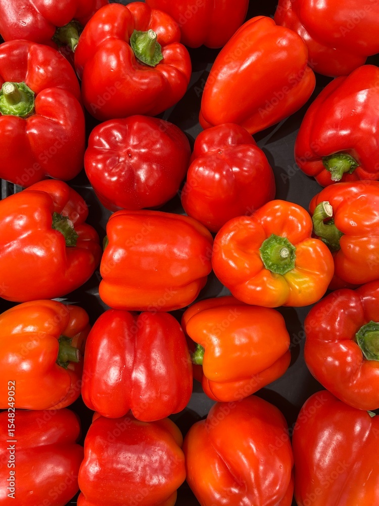 A colorful close-up of freshly harvested red bell peppers, beautifully arranged and glowing with natural shine. This image captures the freshness, texture, and vibrancy of the vegetables.