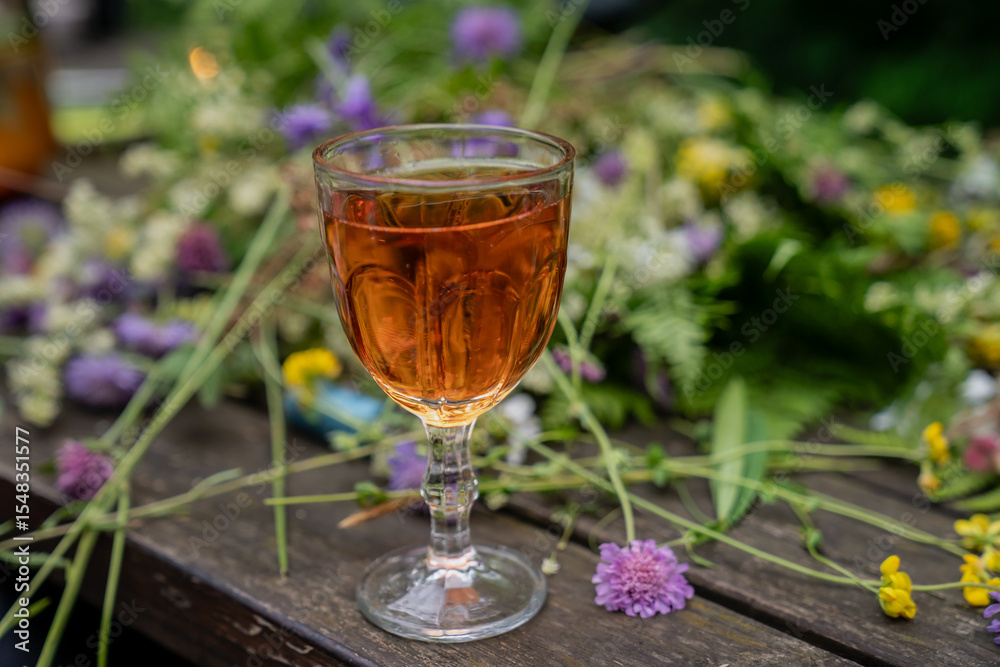 glass of rose wine on rustic wooden table with wildflowers, summer outdoor celebration, floral decoration, countryside picnic, relaxing garden drink, boho aesthetic, midsummer festive setting