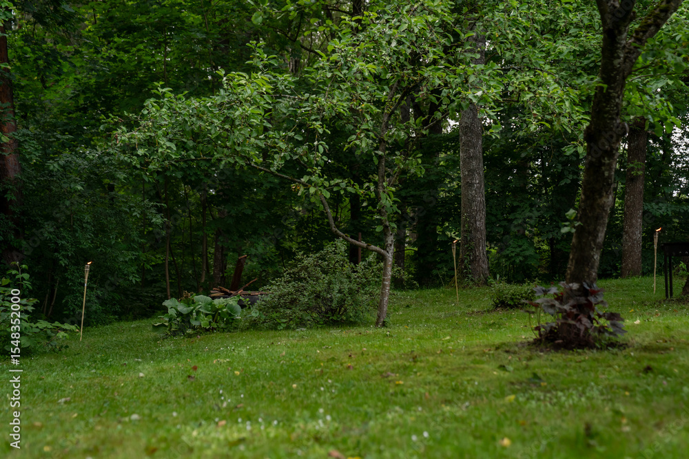 lush green backyard garden with trees and fresh grass in summer, peaceful natural outdoor scenery, forest edge landscape, suburban yard with trimmed branches, tranquil countryside environment