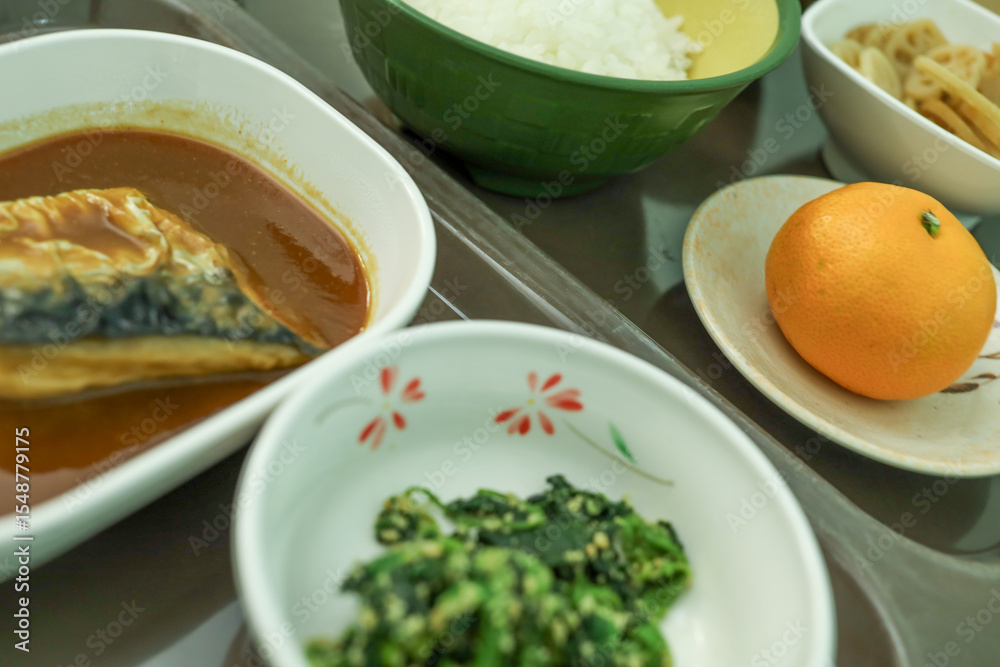 低カロリー減塩病院食(ご飯、さばの味噌煮、レンコンのキンピラ、ほうれん草のあえ物、みかん)