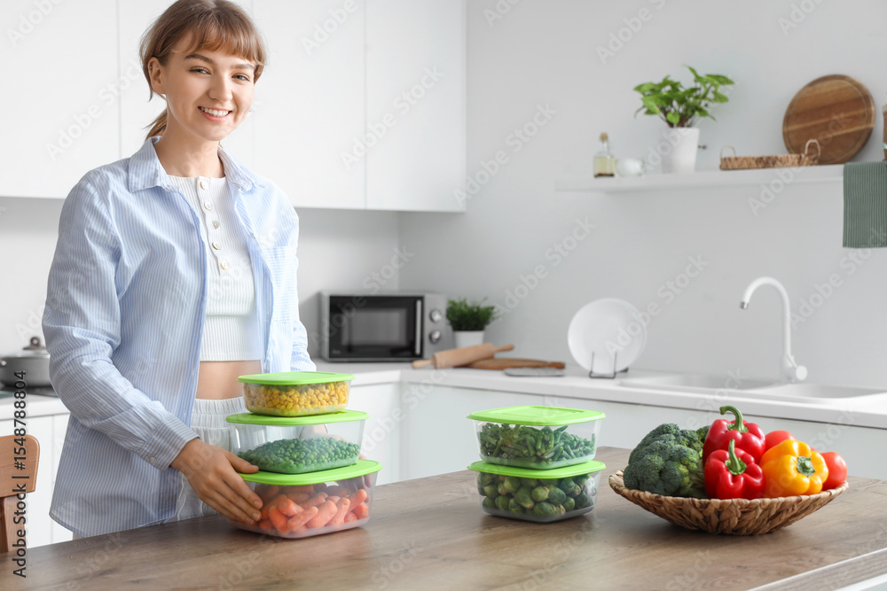 Young woman holding plastic containers with frozen vegetables in kitchen