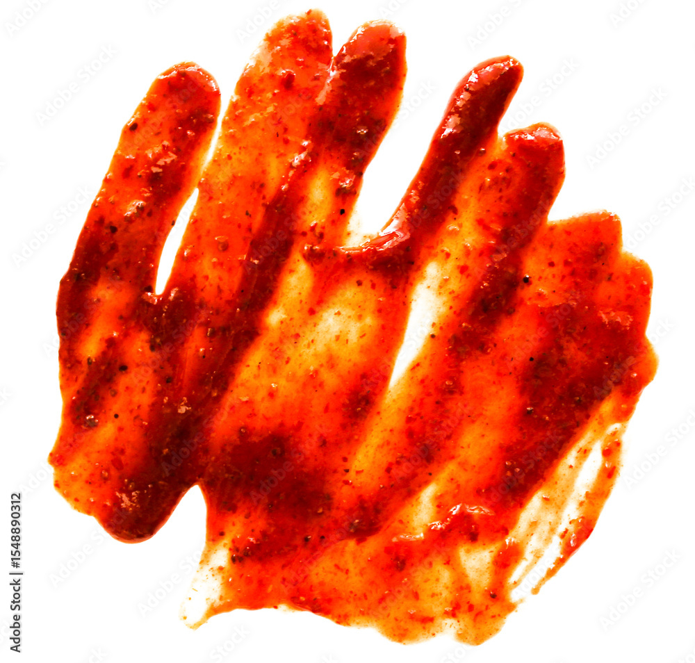 A handprint made with a spicy red sauce, showcasing a vibrant and textured appearance.
