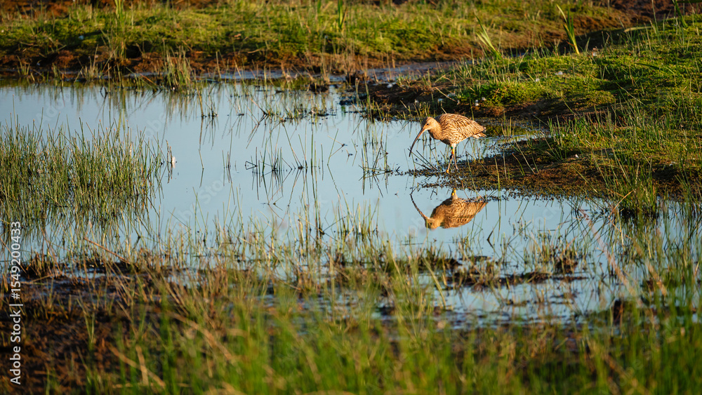 Curlew reflected in Druridge Pools Nature Reserve, which is close to the Northumberland coast and was a former opencast mine, now a popular reserve with wildfowl and waders in the wetland