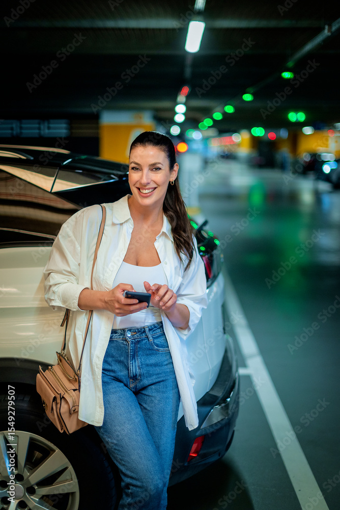 Brunette haired woman standing next to her car in parking garage and using smart phone