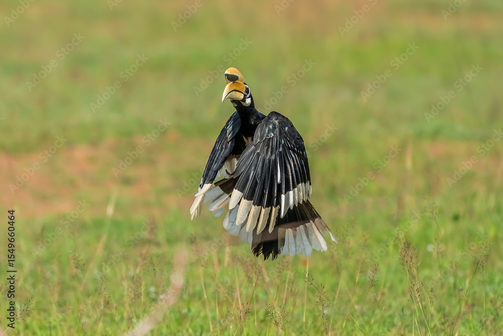 The bill and large hump are yellow. The face is black. The throat is white or yellowish-white. The body is black. The wings are black with a wide yellow stripe running down the middle of the wings.