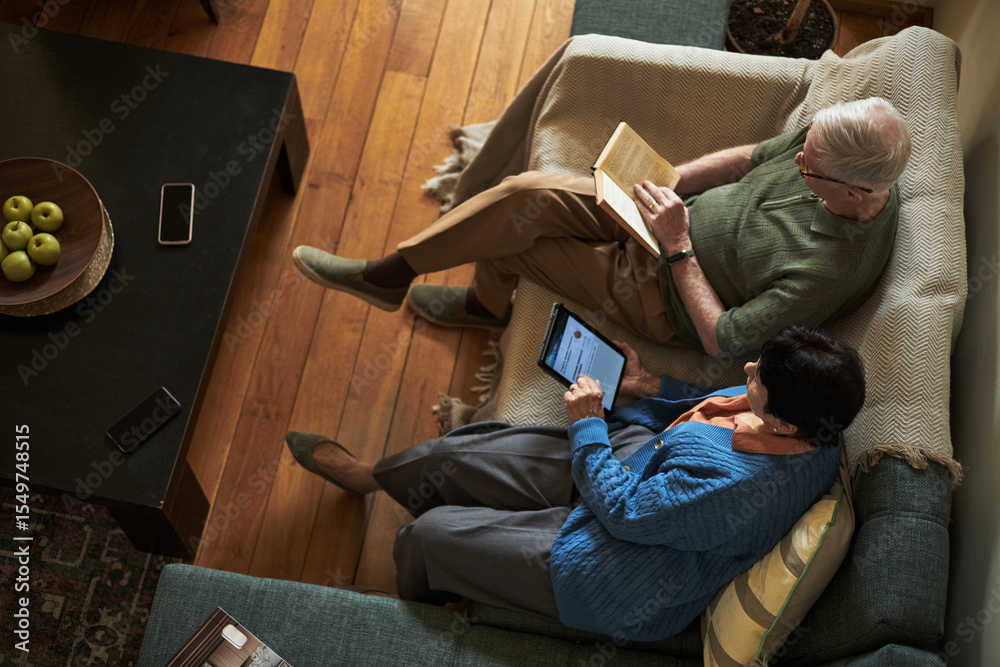 Senior couple spending quality time sitting together on a sofa, man reading book while woman using tablet, surrounded by homey elements. Top-down view capturing a cozy and intimate moment