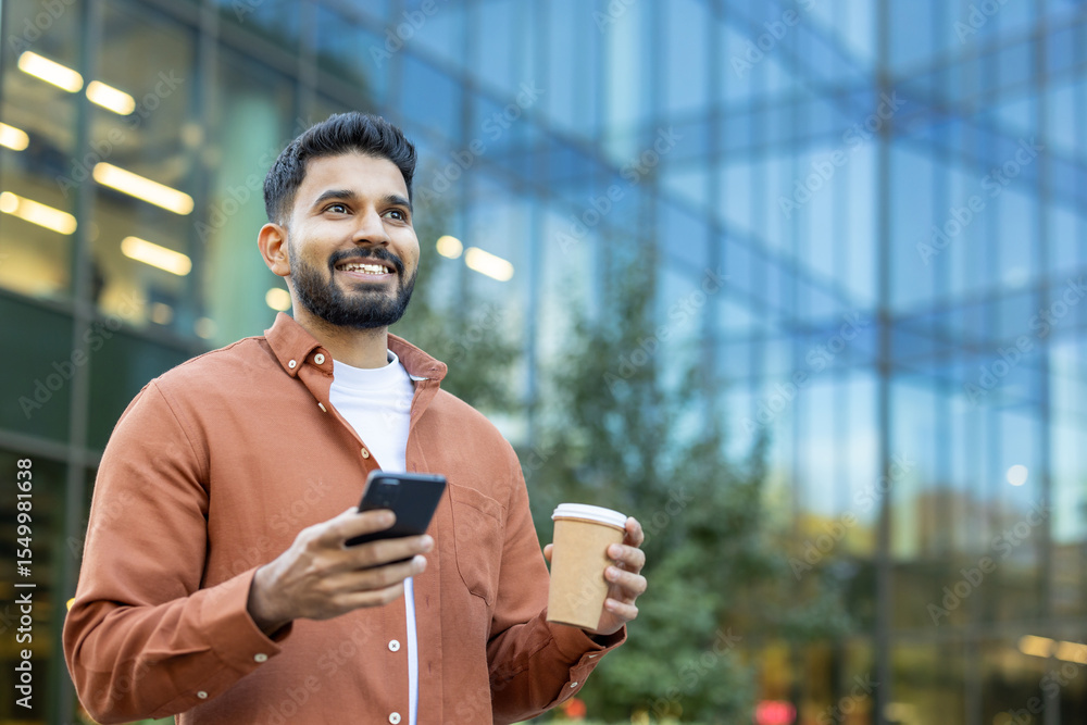 A smiling Indian man holds a coffee cup and smartphone in front of a modern glass building on a sunny day.