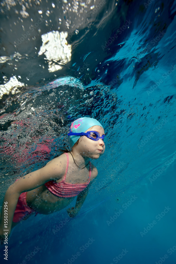 Sports little girl swimming underwater on a blue background in a pink swimsuit. Portrait. Close-up. Shooting under water. Vertical view