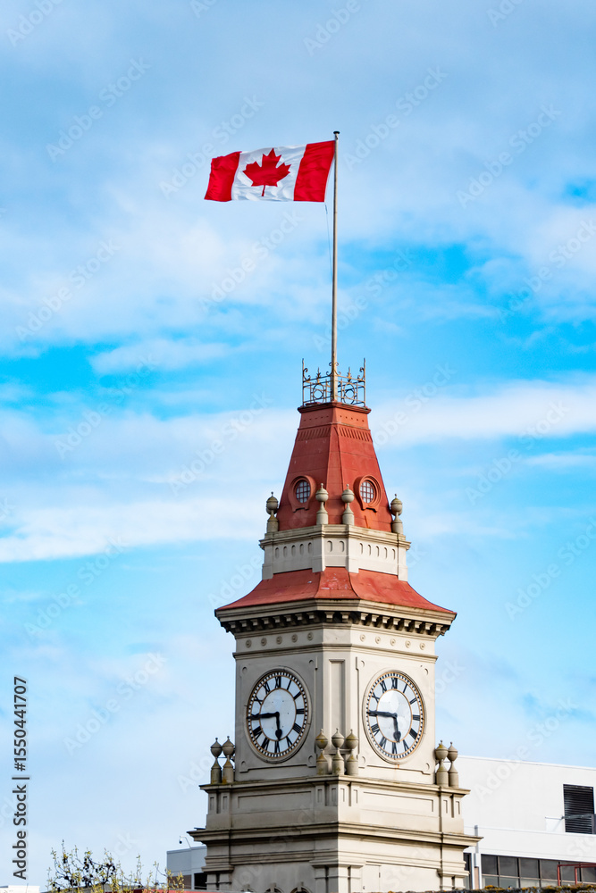 Canadian Flag Patriotically Waving Above Beautiful Clocktower in Victoria, Vancouver Island, BC