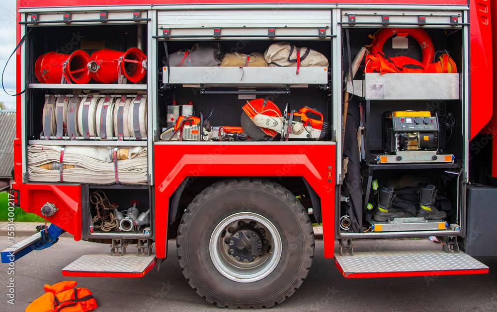 Detailed view of emergency response equipment organized in a fire truck at a station during daytime