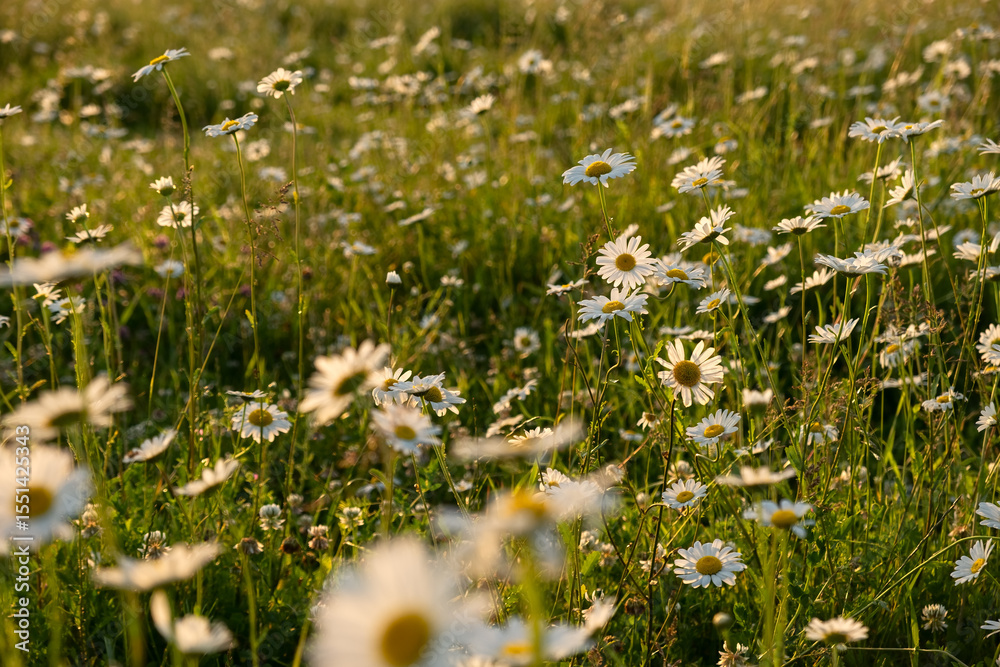 Bright rays of the sun illuminate the field with daisies. Evening warm sunset light. Landscape of a spring field with flowers. Beautiful golden sunny background. Conceptual atmospheric summer mood