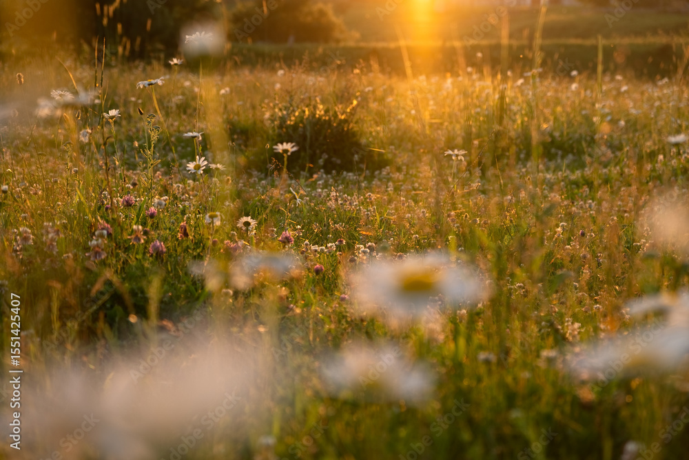 Bright rays of the sun illuminate the field with daisies. Evening warm sunset light. Landscape of a spring field with flowers. Beautiful golden sunny background. Conceptual atmospheric summer mood