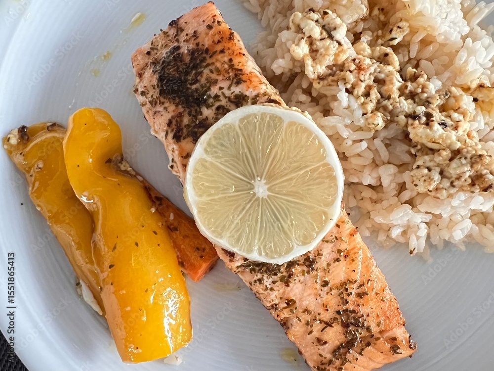 Grilled salmon fillet with herbs and lemon slice served with basmati rice and colorful vegetables, e.g. carrots and yellow bell peppers.