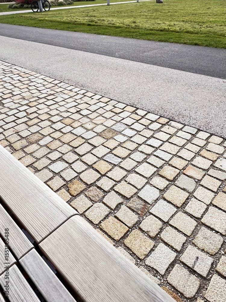 Modern gardening and patio design: a mix of paving stones, paved path, wooden benches, and artificial turf