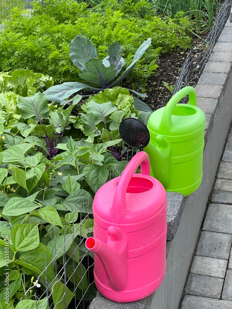 Two green and pink watering cans are ready for watering on the edge of a raised bed for vegetables and herbs next to the paved terrace