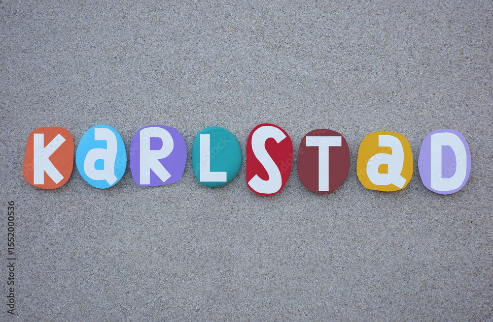 Karlstad, Sweden, seat of Karlstad Municipality, the capital of Värmland County, and the largest city in the province Värmland in Sweden. Souvenir composed with multi colored hand painted stone letter