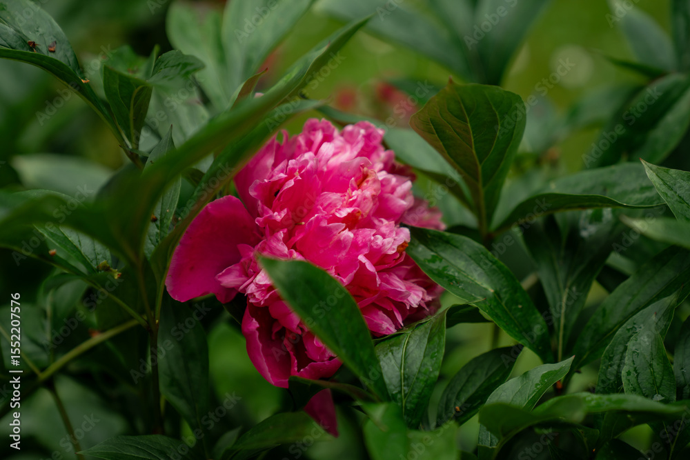 bright pink peony flower blooming in lush green garden foliage, closeup of vibrant summer blossom in natural outdoor setting, botanical photography of colorful floral beauty and seasonal plant growth