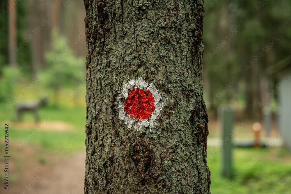 tree with red and white trail marker in forest, hiking trail sign painted on bark in woodland, forest navigation symbol, outdoor adventure concept, eco tourism and nature travel background image