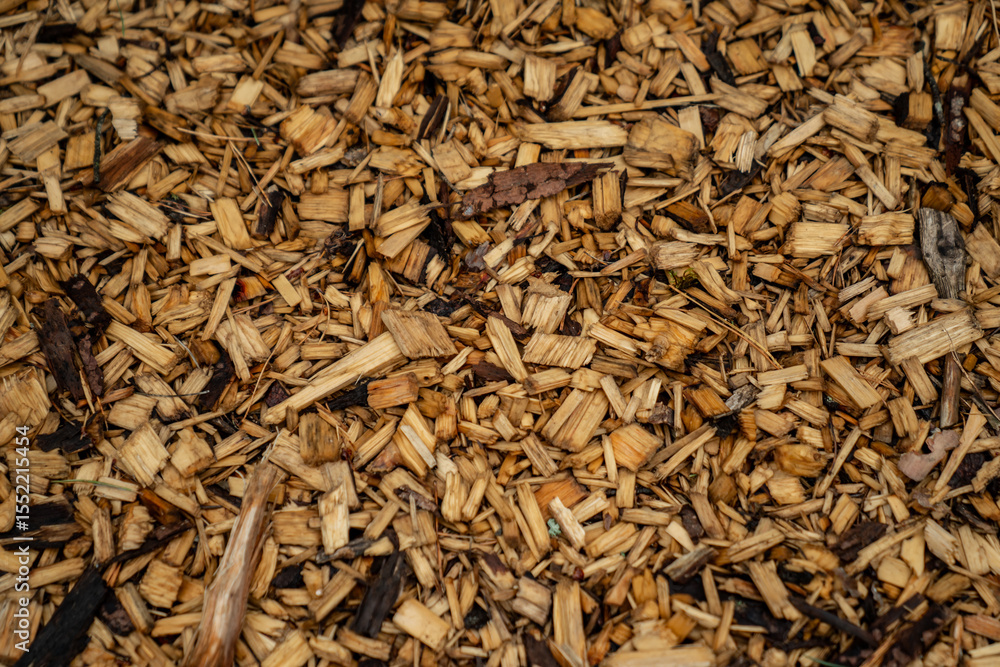 natural wood chips mulch background texture in outdoor park, shredded bark ground cover for landscaping, brown organic wood pieces on soil surface for gardening and playgrounds environmental design