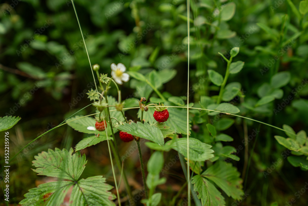 wild strawberries growing in green forest undergrowth with blooming white flowers, fresh summer berries on natural background, organic fruit plant in woodland environment close up macro photography
