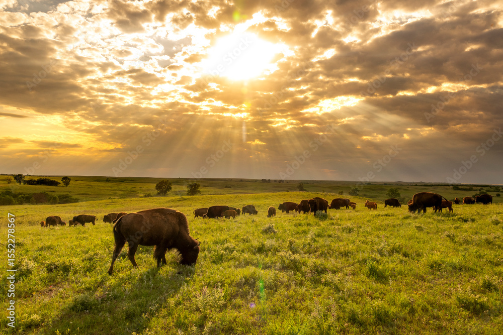 These impressive American Bison wander the Kansas Maxwell Prairie Preserve at Sunrise
