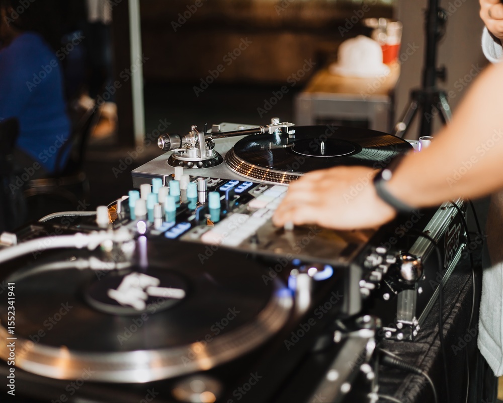 Close-up of DJ mixer and dual turntables with vinyl records and hands adjusting controls at a live event