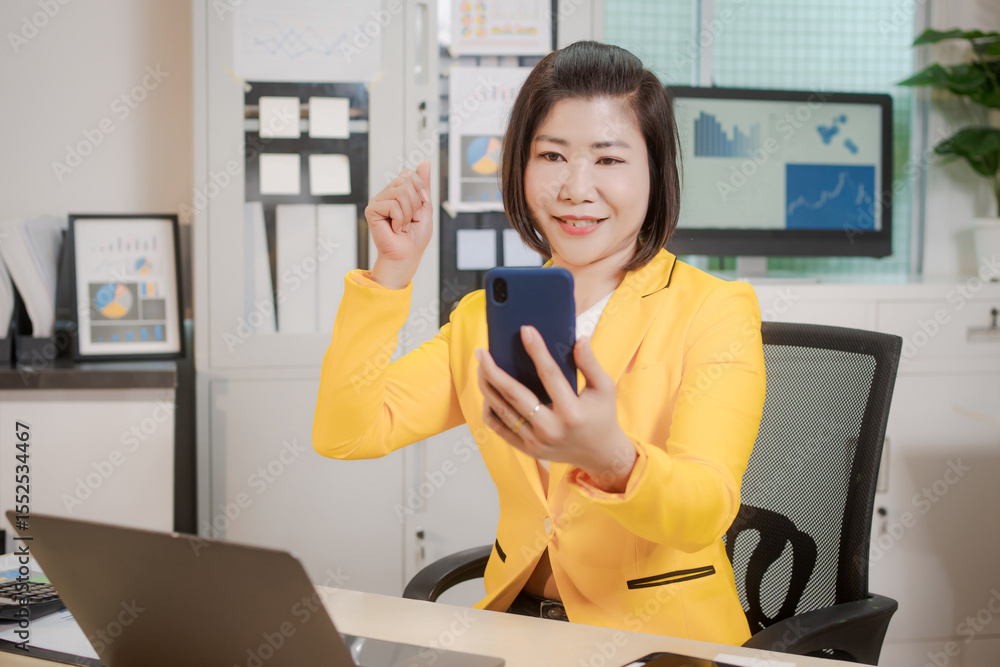 A middle-aged Asian woman sits at a work desk, deeply focused. Surrounded by charts and notes, she analyzes data, plans strategies, and prepares to lead a presentation or consultative session