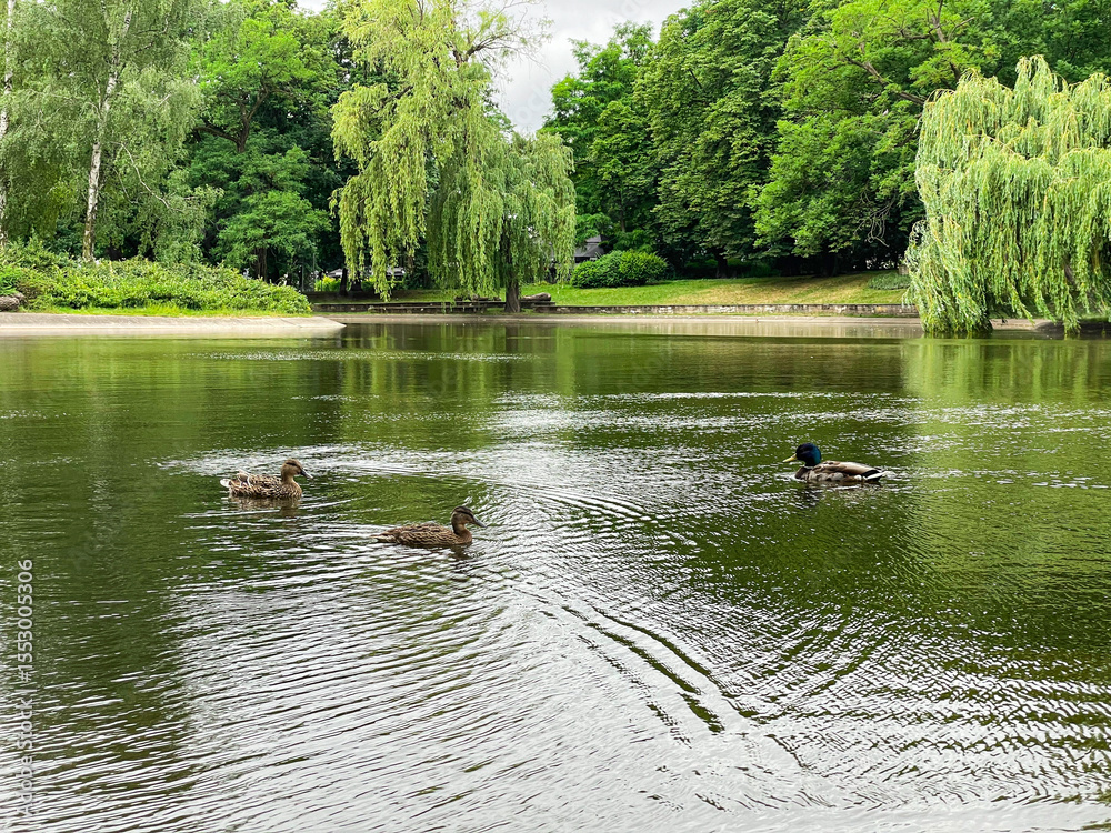 Peaceful summer landscape with a group of ducks near a calm river in a green park — tranquil nature scene with waterfowl, trees, and blue sky, ideal for rural, wildlife, or outdoor themes