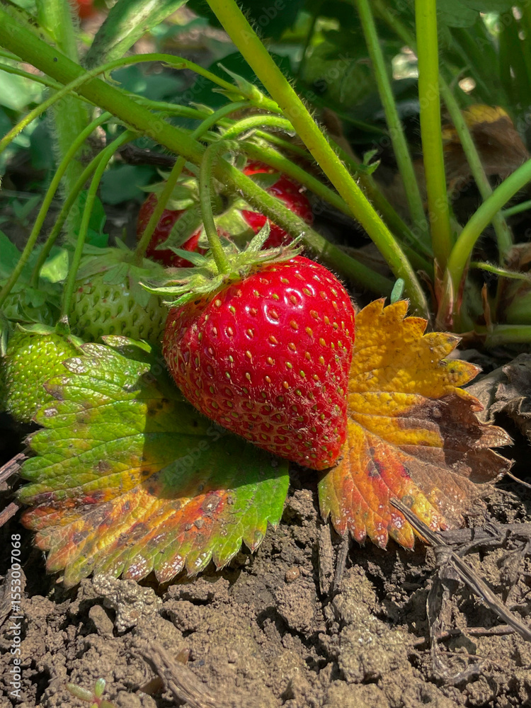A close-up view of a strawberry plant in a garden, with ripe red strawberries and unripe green ones nestled among lush green leaves