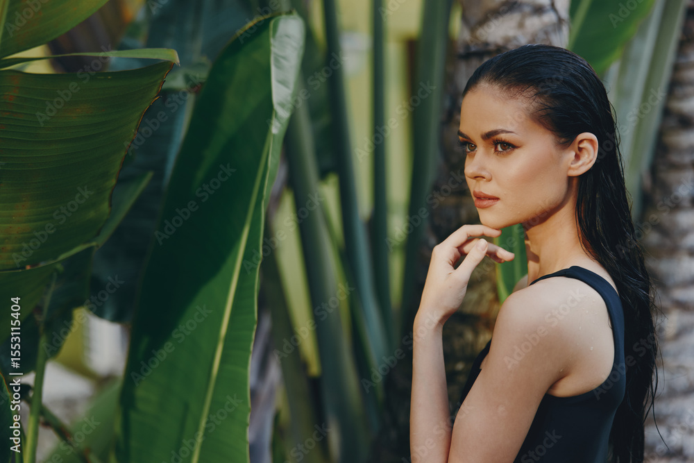 Exotic Asian woman with long black hair posing near lush green plants and palm trees