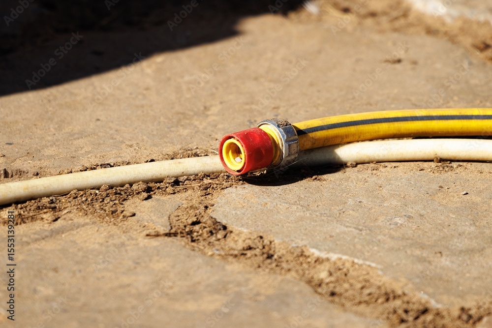 A collection of water hoses sprawled on warm concrete, revealing the aftermath of a day spent nurturing plants.