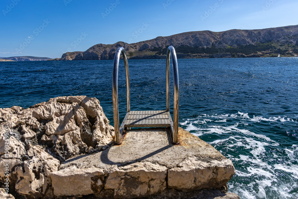 Metal handrail at the stairs leading to the sea, entry to the water via metal stairs KRK Baska Croatia