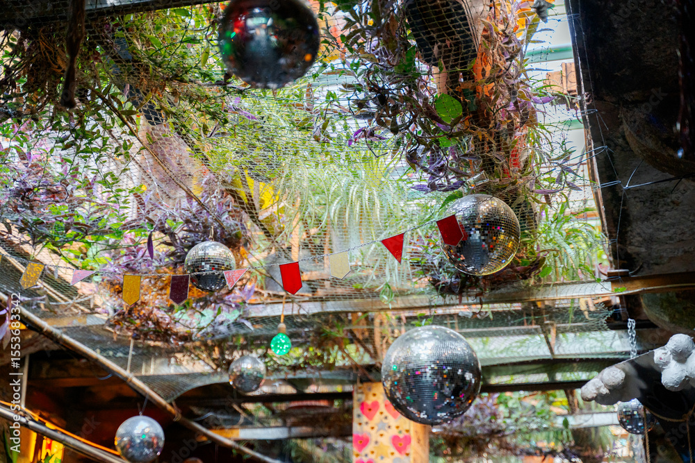 Eclectic Ceiling Decor with Disco Balls and Hanging Plants in Szimpla Kert Ruin Bar, Budapest