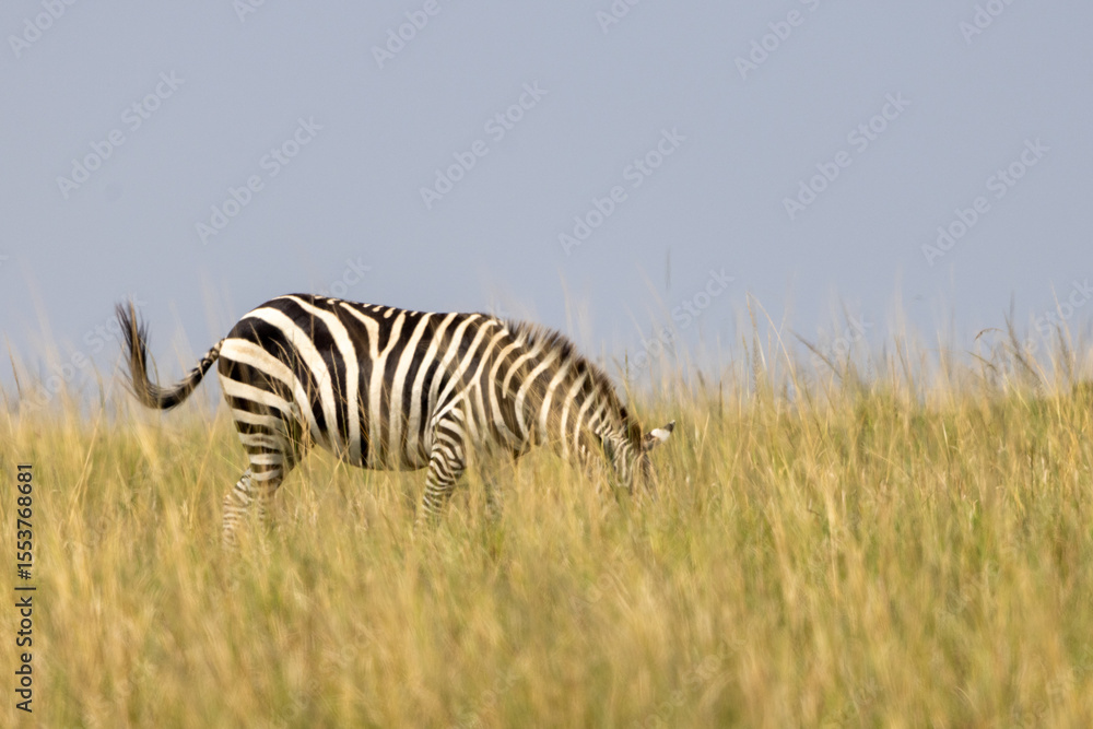 Alone zebra grazing in the vast grasslands of Masai Mara, Kenya. Wildlife photo capturing the natural habitat and behavior of plains zebra in East African savannah during daylight.