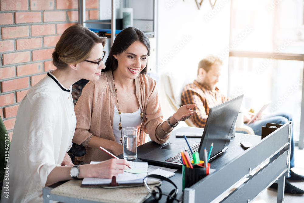 Happy smiling manager sitting beside colleague