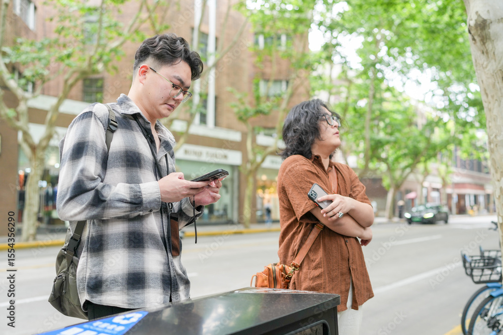 Two Chinese men in their early twenties, both wearing glasses, are smoking and using their smartphones at a designated smoking area on a spring afternoon in the Huangpu District of Shanghai, China.