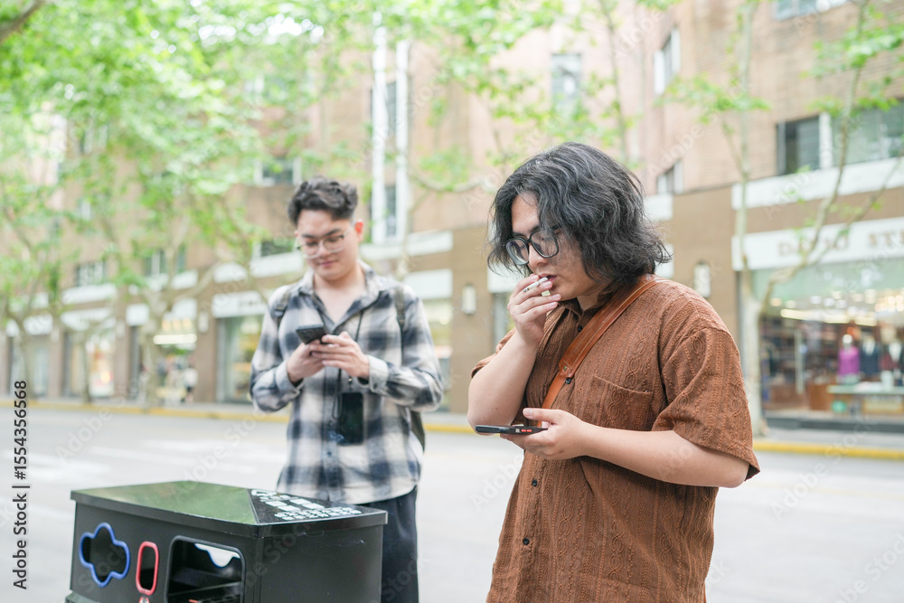 Two Chinese men in their early twenties, both wearing glasses, are smoking and using their smartphones at a designated smoking area on a spring afternoon in the Huangpu District of Shanghai, China.