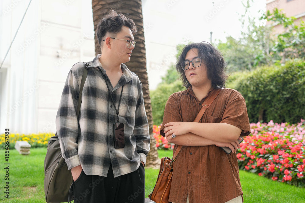 Two young Chinese men in their early twenties, wearing glasses, are standing and talking in a bustling part of the city during a warm spring afternoon in May, Huangpu District of Shanghai, China.