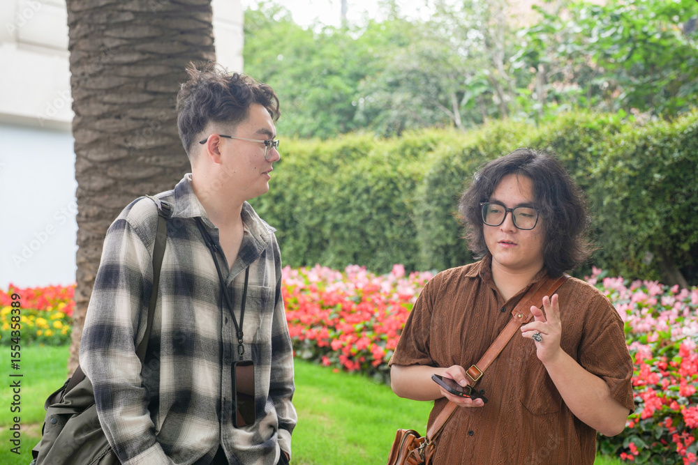 Two young Chinese men in their early twenties, wearing glasses, are standing and talking in a bustling part of the city during a warm spring afternoon in May, Huangpu District of Shanghai, China.