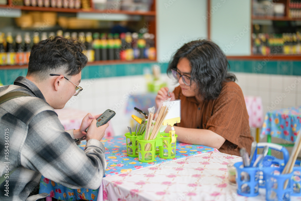 Two Chinese men in their early twenties, both wearing glasses, are casually waiting at a Thai restaurant for their meal to be prepared on a pleasant spring day in Huangpu District, Shanghai, China.
