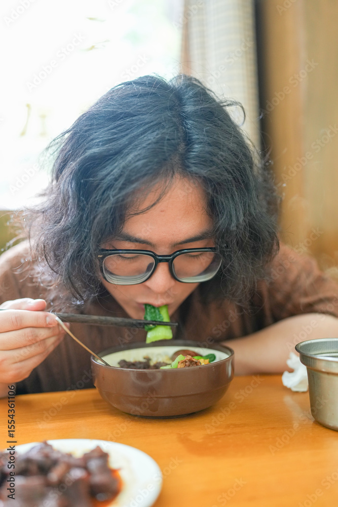 Two young Chinese men in their early twenties, both wearing glasses, are eating lunch together at a Taiwanese restaurant, enjoying a casual spring afternoon in Huangpu District of Shanghai, China.