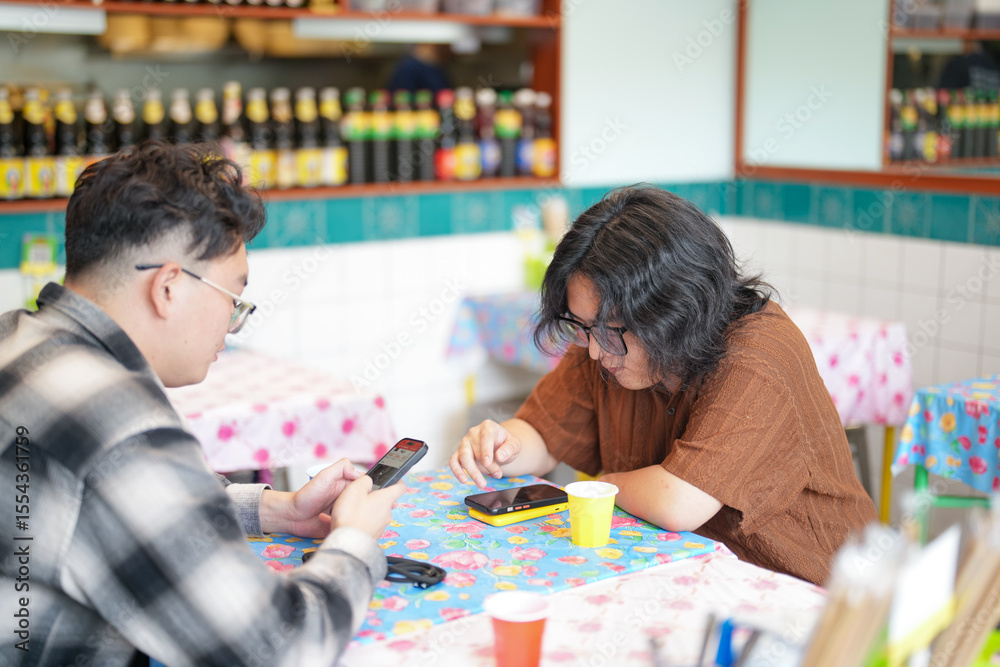 Two Chinese men in their early twenties, both wearing glasses, are casually waiting at a Thai restaurant for their meal to be prepared on a pleasant spring day in Huangpu District, Shanghai, China.
